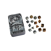 Dentro de esta lata encontrarás 16 dados, con un set principal en un color, un set secundario en otro para manejar múltiples enemigos al mismo tiempo, y dos d20 especiales listos para cuando cada criatura en el mapa necesite tirar iniciativa al unísono.