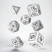 Un conjunto de siete dados poliédricos adecuados para juegos de mesa. Cada cara está inscrita con números de fantasía, y su perímetro garabateado con runas de Elder Futhark. ¡Perfecto para tu personaje enano o druida!