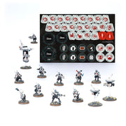 El set está compuesto por 183 piezas de plástico y se entrega con 10 peanas redondas Citadel de 25 mm, 3 peanas de volador pequeñas Citadel, 1 varilla de volador grande Citadel y dos varillas de volador pequeñas Citadel. También incluye una hoja de calcomanías de la Infantería del Imperio T’au con 185 calcomanías al agua de gran calidad para que decores tus miniaturas.