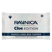 CONTENIDO: 8 sobres de Ravnica: Clue Edition, 21 cartas de pruebas, 1 tierra Choque foil, 4 pantallas para ocultar información, 1 cuaderno de investigación, 1 sobre de caso cerrado y 1 caja guardacartas