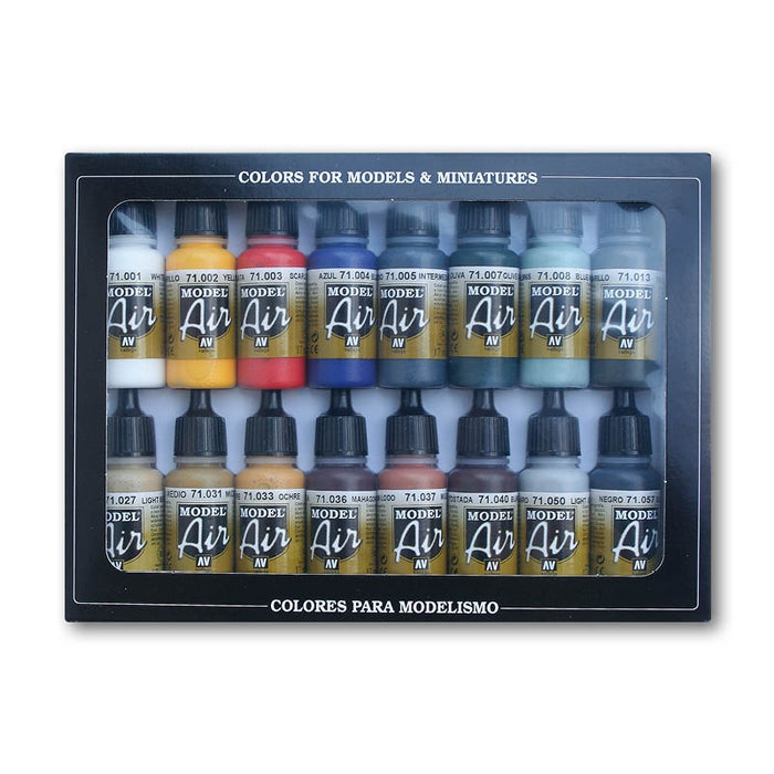 Estuche de 16 colores Model Air para pintar maquetas, miniaturas y dioramas. Contiene botellas de 17 ml./0.57 fl.oz. (con cuentagotas) y una carta de colores.