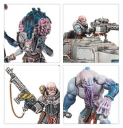 Los Cultos Genestealer surgen de las sombras como una marea de acólitos mutantes, soldados traidores y depredadores xenos. Emplean emboscadas y subterfugio para superar a sus enemigos, convirtiendo material de minería y vehículos readaptados en potentes armas de rebelión contra los odiados opresores imperiales.