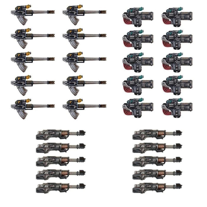 - 1x Legion Heavy Weapons Upgrade Set – Volkite Culverins, Lascannons, and Autocannons, con 10 volkite culverins, 10 lascannons, y 10 autocannons, además de brazos para cada una y 4 augury scanners