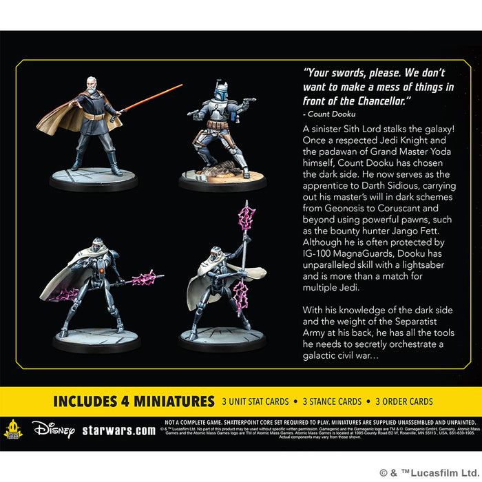 ¡Un Siniestro Lord Sith acecha la galaxia! Antaño un respetado caballero jedi y padawan del mismísimo gran maestro Yoda, el conde Dooku ha elegido el camino del Lado Oscuro. Ahora es el aprendiz de Darth Sidious, cuyos designios se encarga de cumplir en siniestras conspiraciones que afectan a Geonosis, Coruscant y muchos otros mundos empleando a poderosos sicarios como el cazarrecompensas Jango Fett. Aunque suele estar protegido por magnaguardias IG-100, Dooku posee una destreza sin igual con el sable de luz y es capaz de enfrentarse a varios jedis a la vez. Con sus conocimientos del Lado Oscuro respaldados por el poder del ejército separatista, Dooku posee todas las herramientas que precisa para maquinar en secreto una guerra civil galáctica....