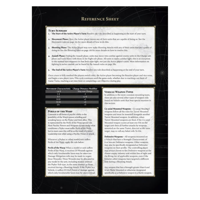 – Core Rules: You’ll learn about the general principles of the game, its turns and phases, how to command your units, measure distances, shoot at enemies, and charge into melee. You’ll also learn about Reactions, which allow each player to respond to unfolding events even when it's not their turn.